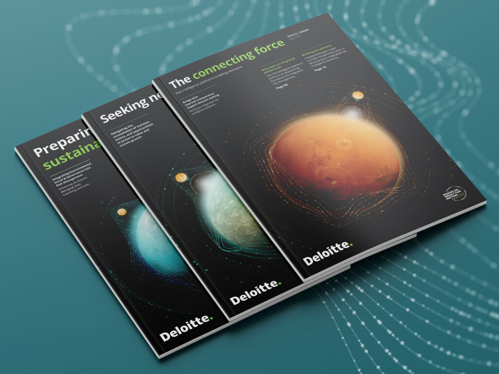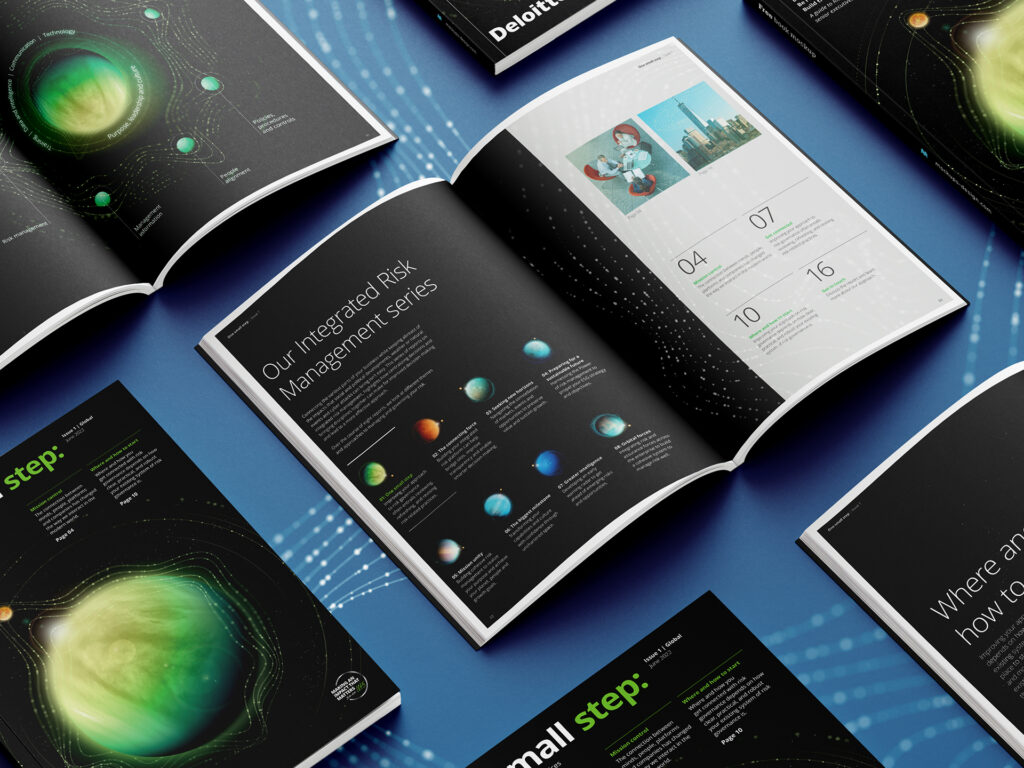 For Deloitte’s Integrated Risk Management report series, we used planets as a visual representation of how company’s need to keep an eye on the bigger picture – to see the connections between markets, events and opportunities to preserve value and sustain growth.